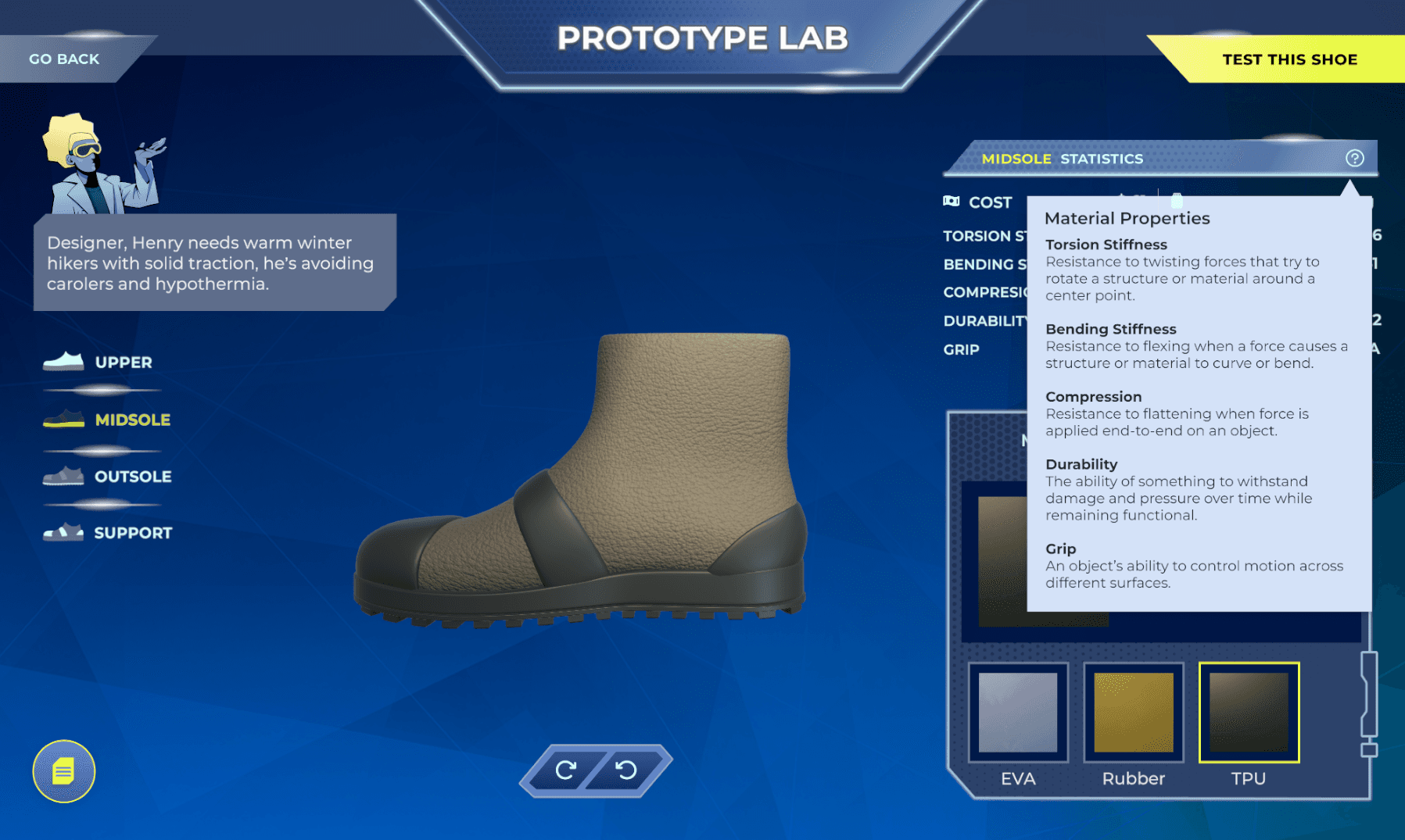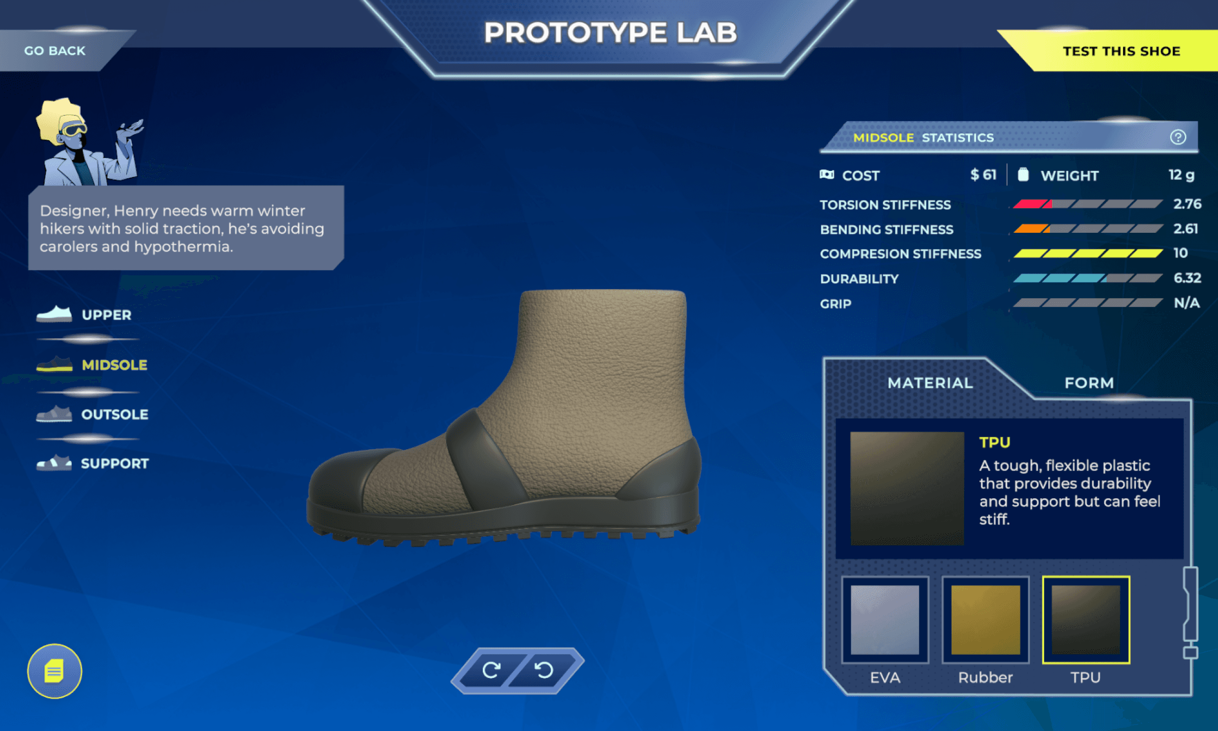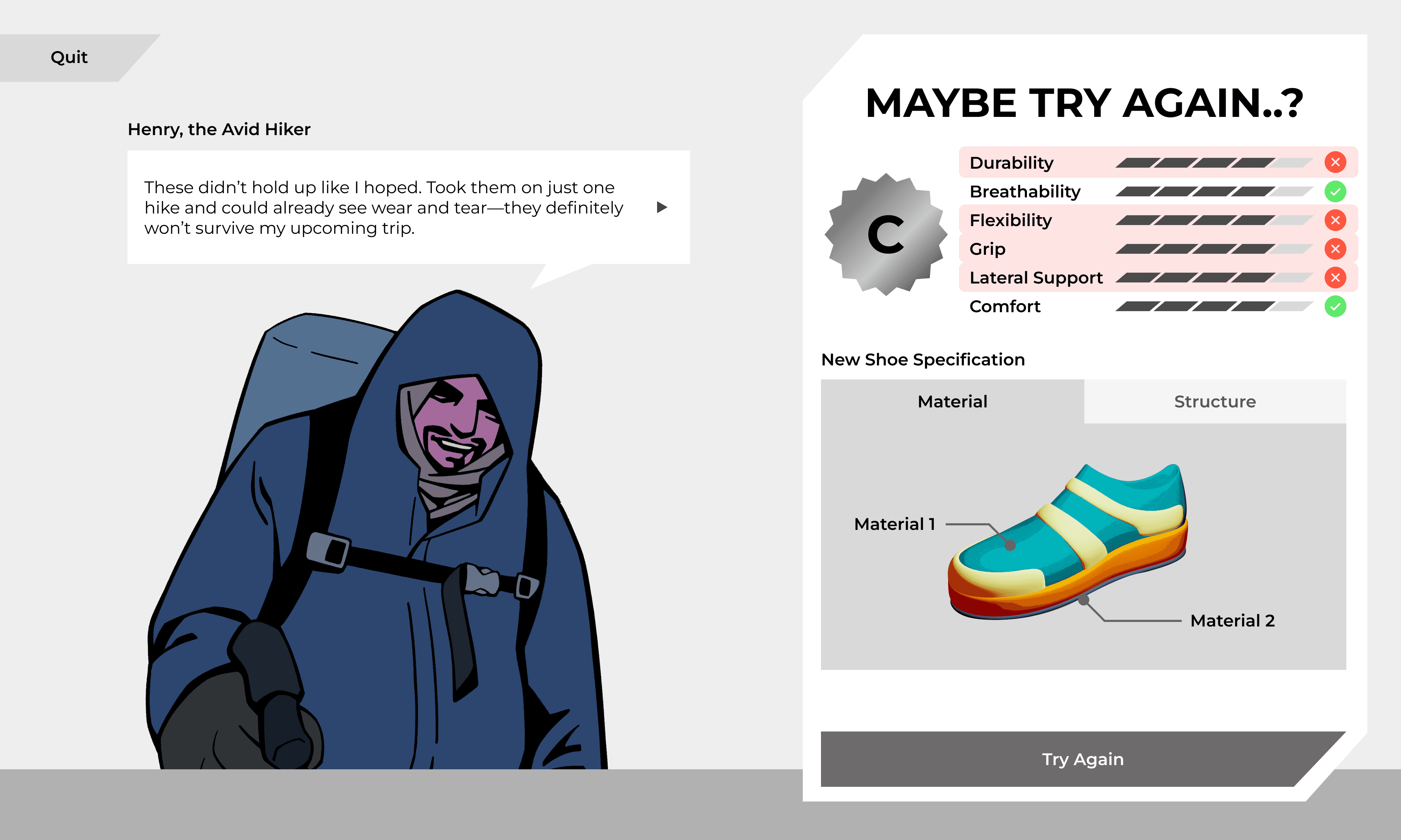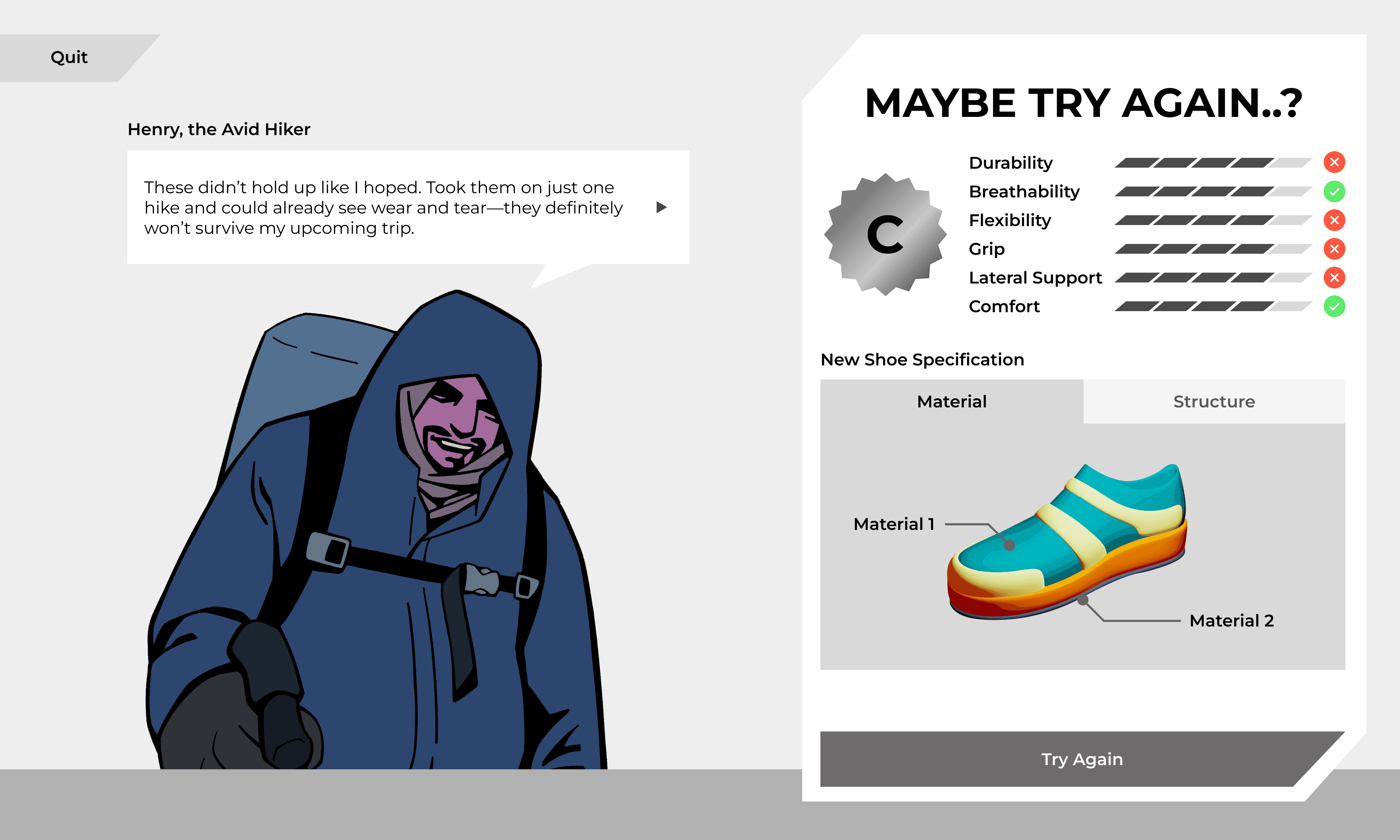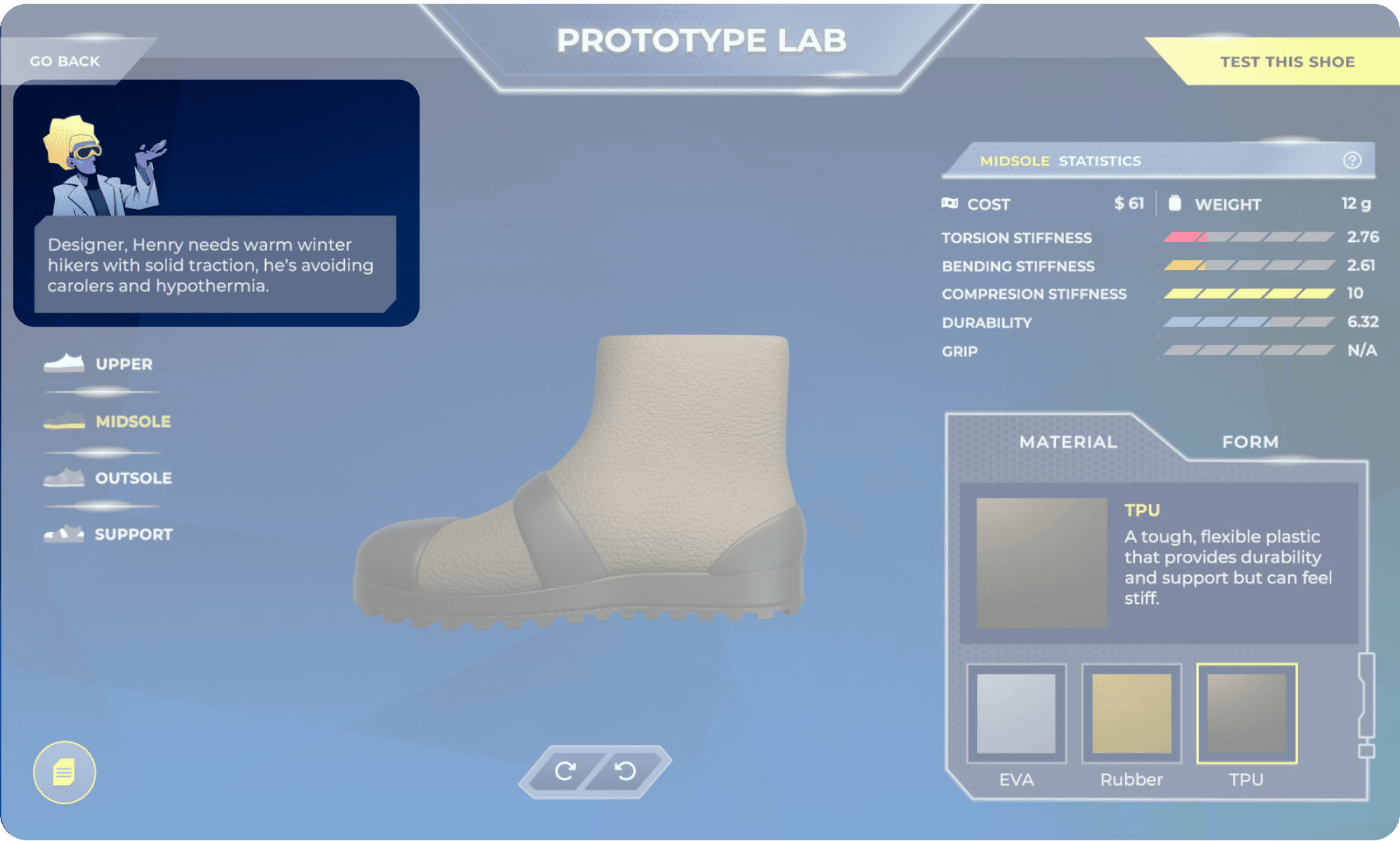 Playtesting revealed a significant cognitive gap between reading customer requirements and selecting technical shoe parameters. Users were overwhelmed by the transition, struggling to translate abstract needs into material properties.