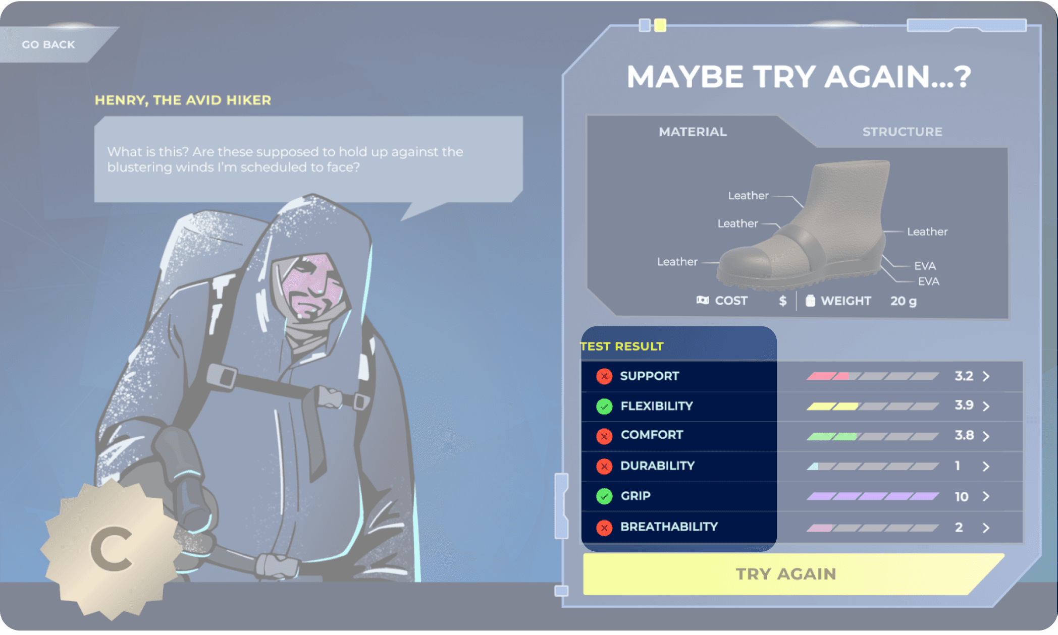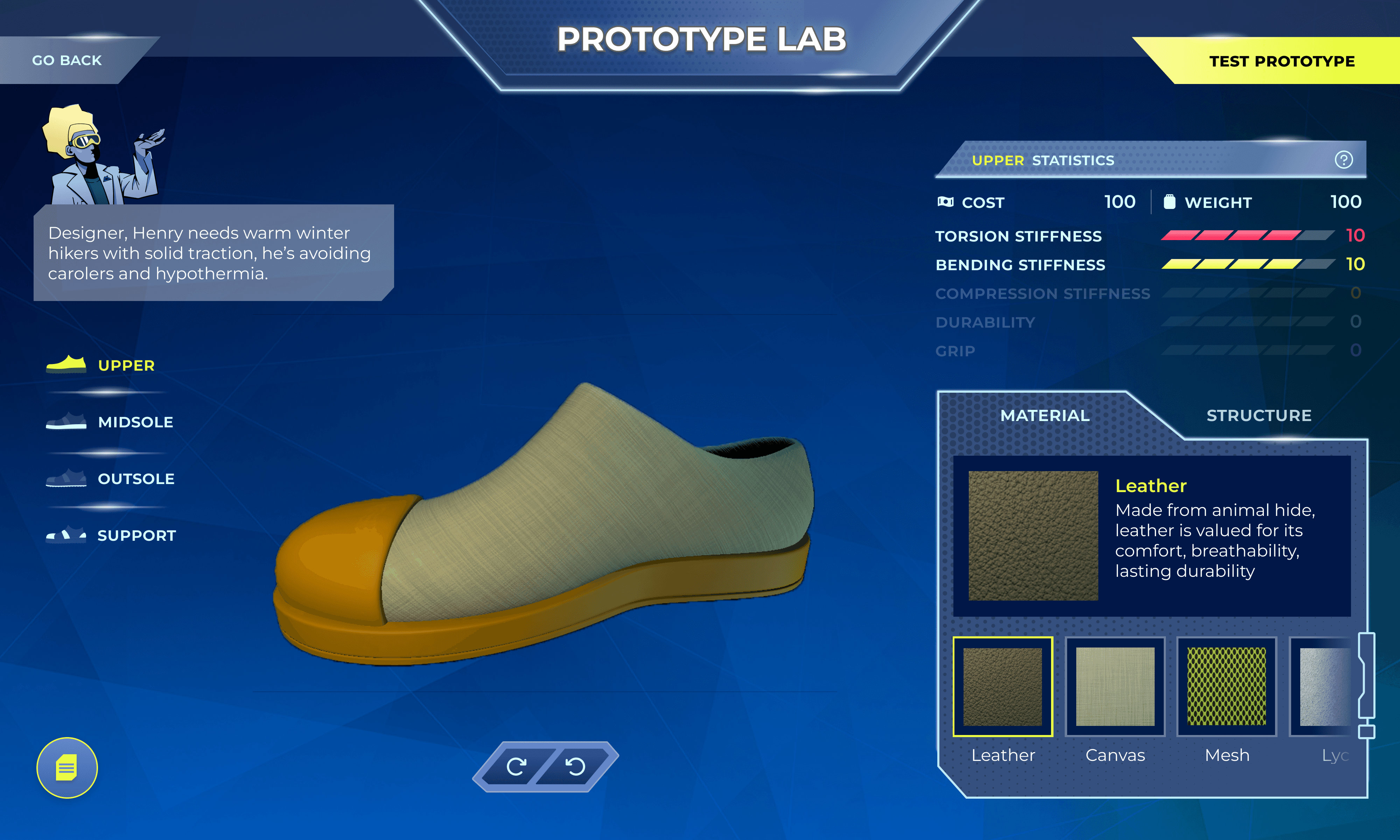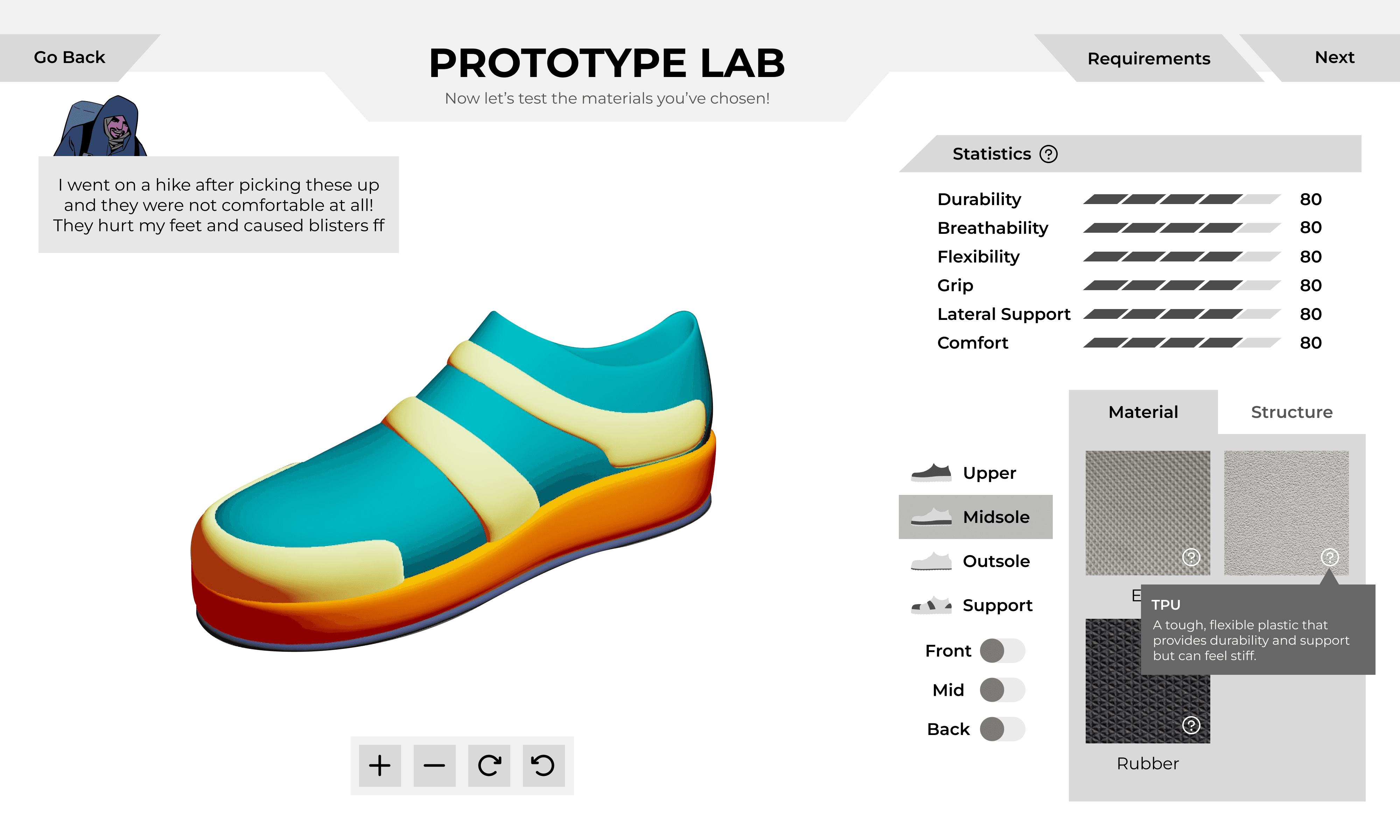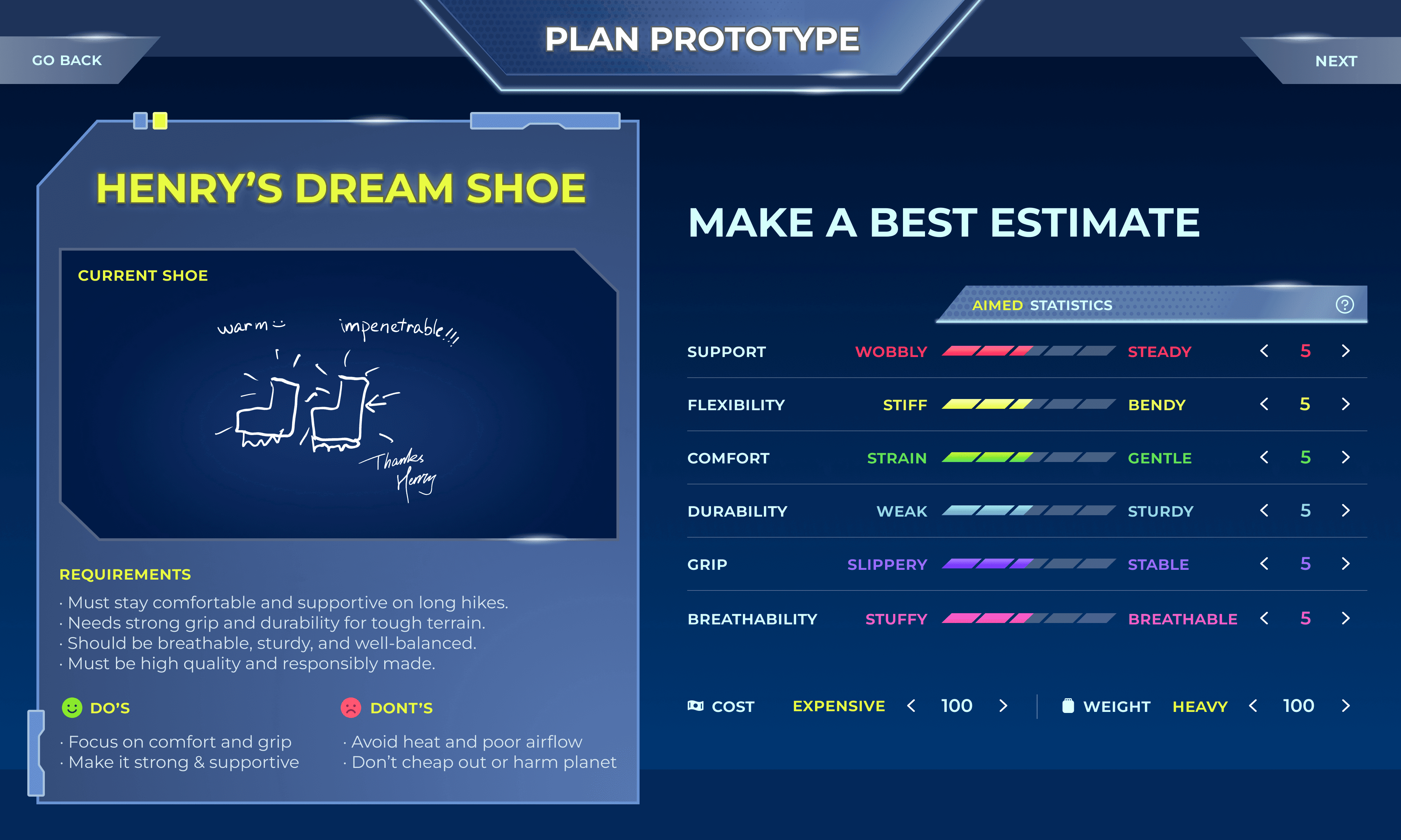 Playtesting revealed a significant cognitive gap between reading customer requirements and selecting technical shoe parameters. Users were overwhelmed by the transition, struggling to translate abstract needs into material properties.