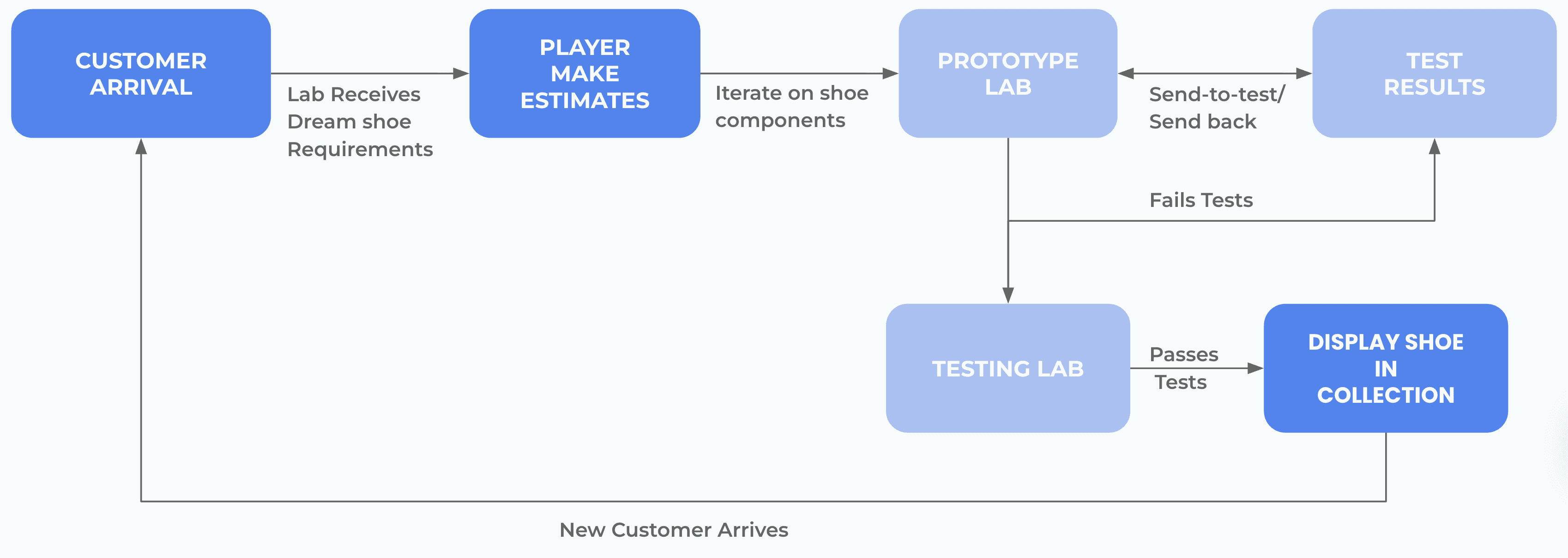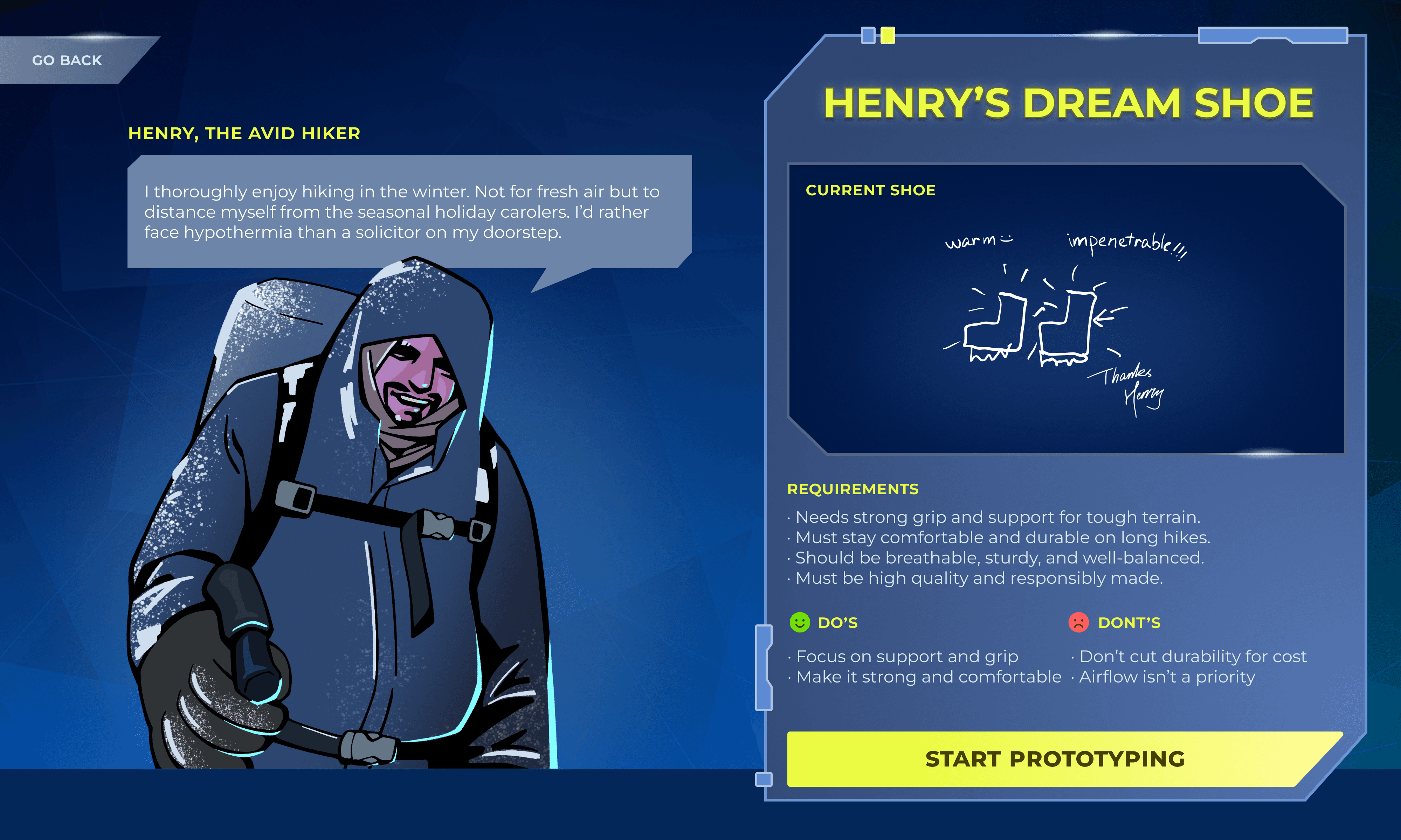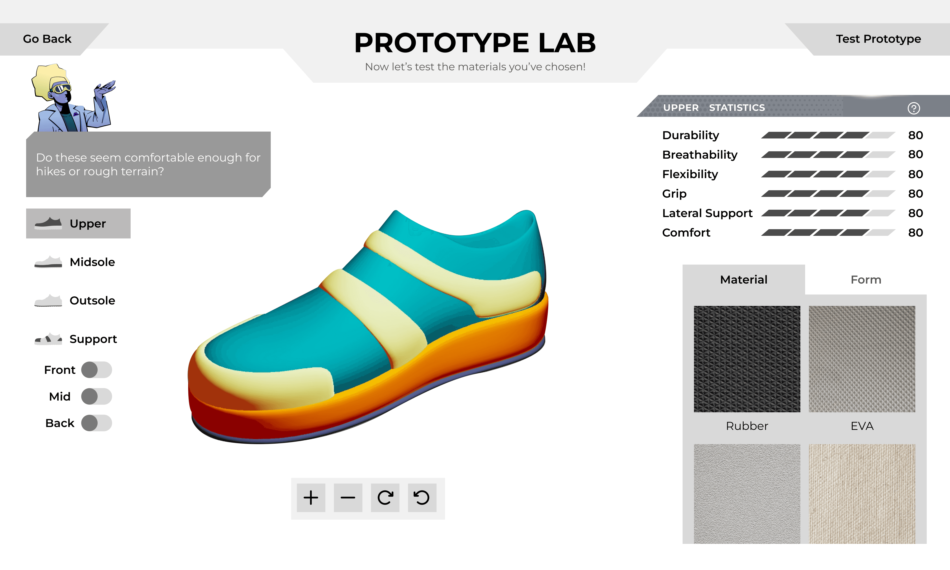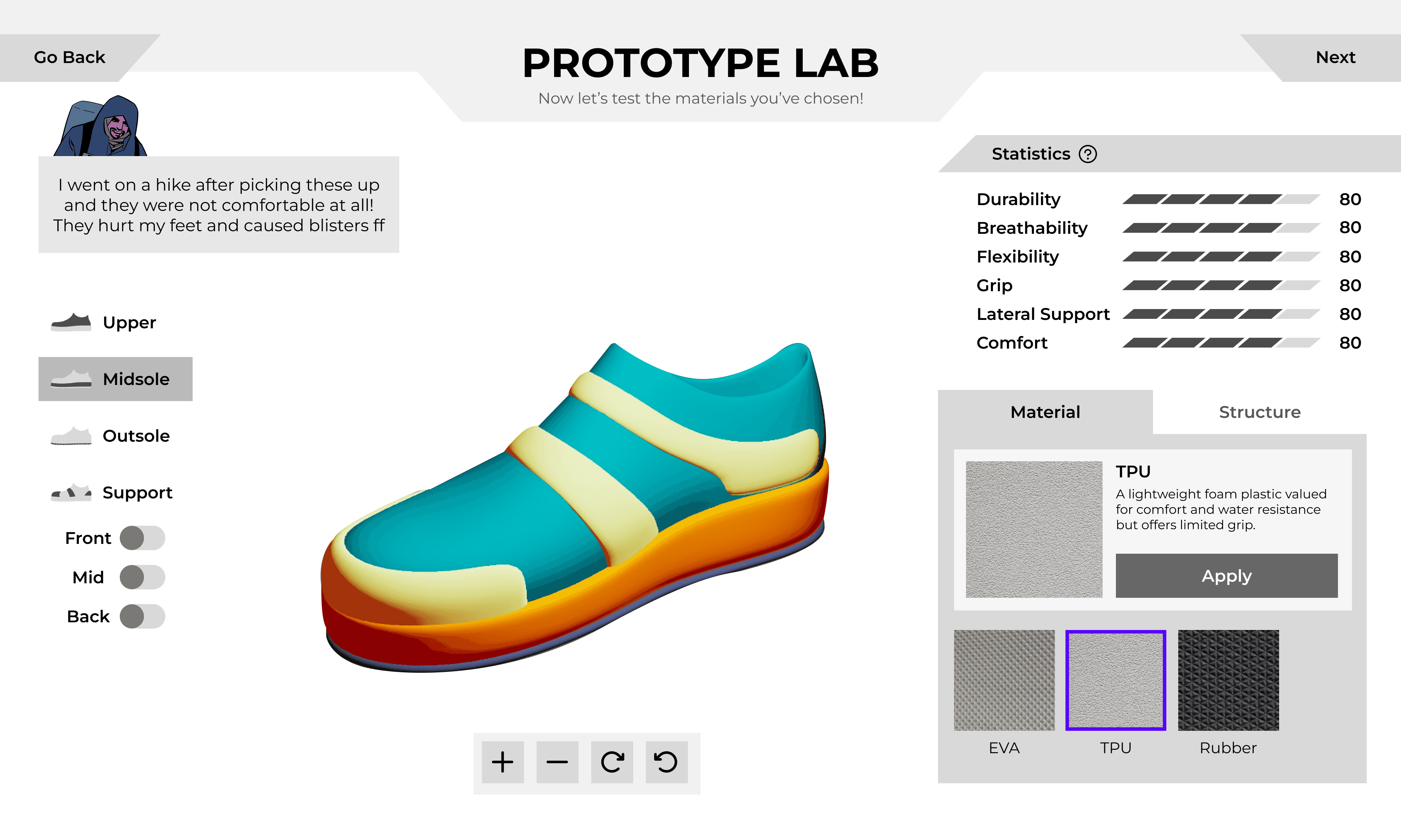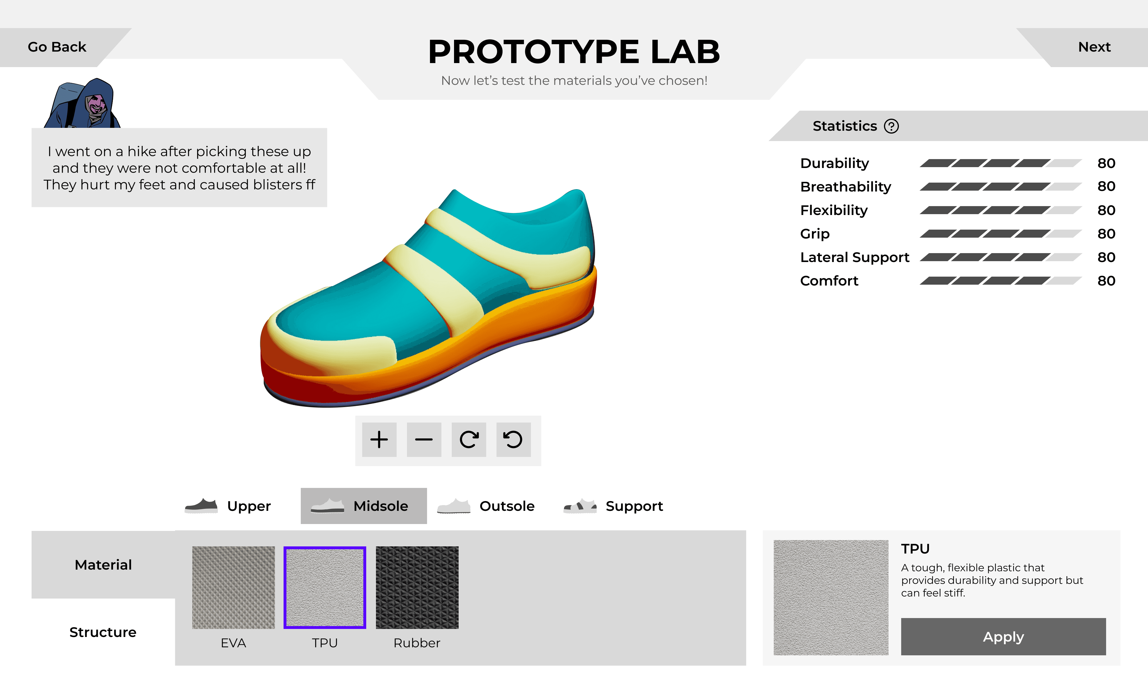 Playtesting revealed a significant cognitive gap between reading customer requirements and selecting technical shoe parameters. Users were overwhelmed by the transition, struggling to translate abstract needs into material properties.