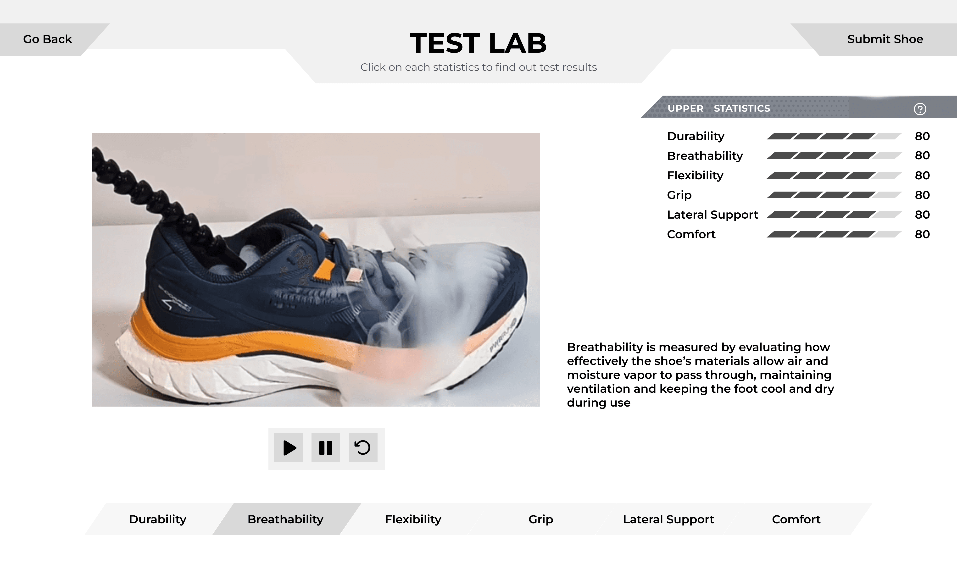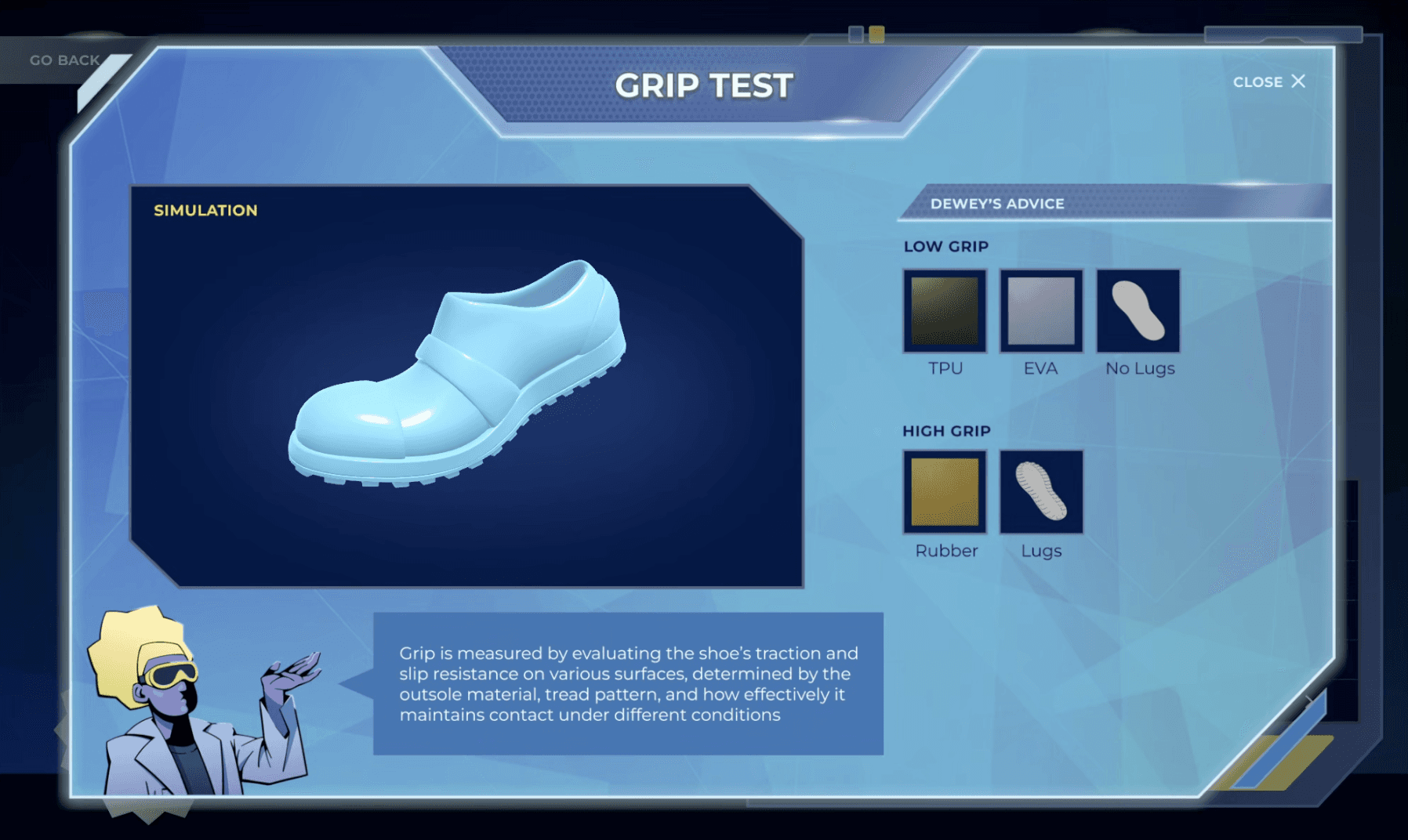 Kicks Lab is a simulation-based shoe design game in which students aged 13-18 apply scientific principles to solve practical problems in a classroom setting through problem diagnosis, iterative failure, and real time data analysis.