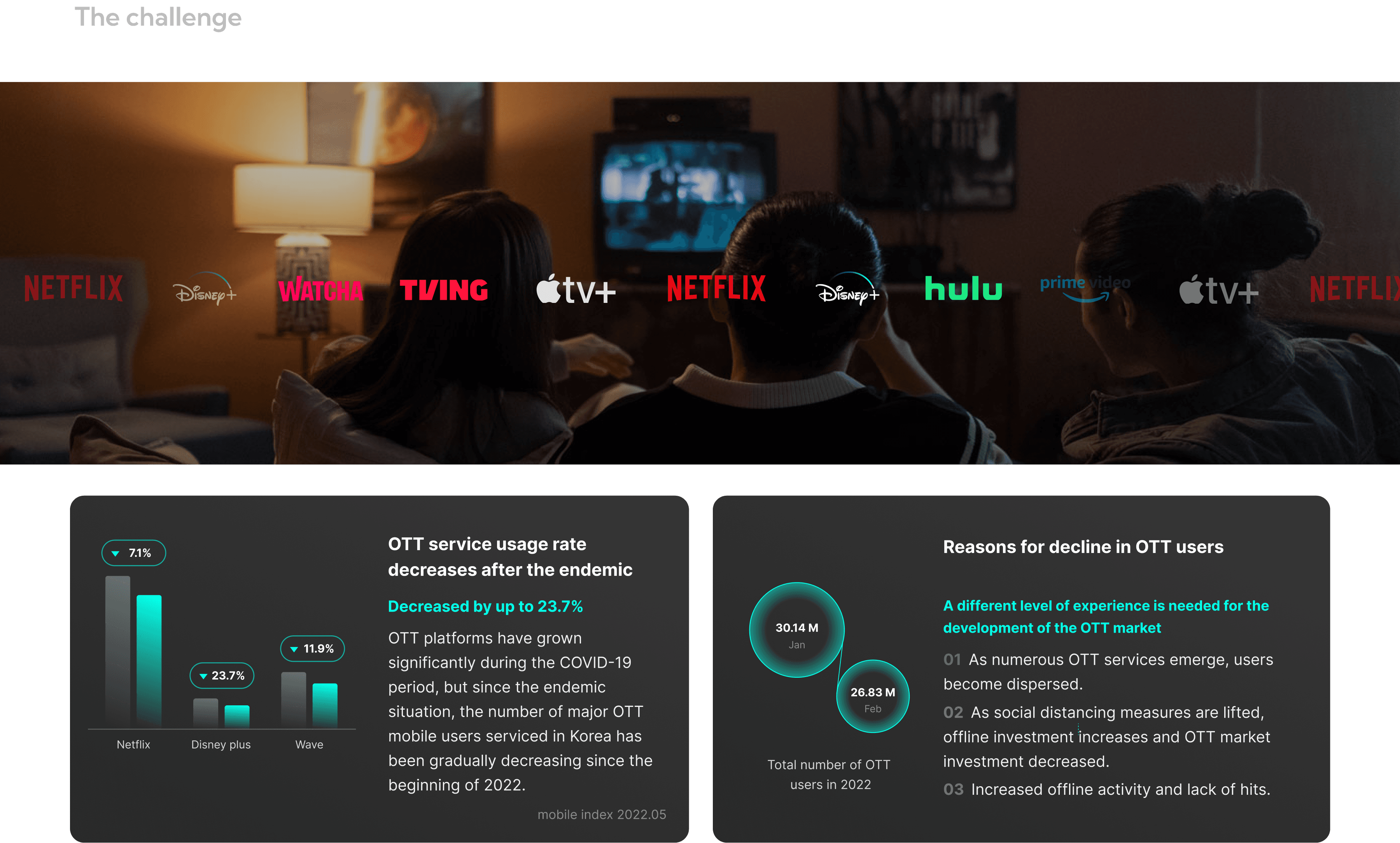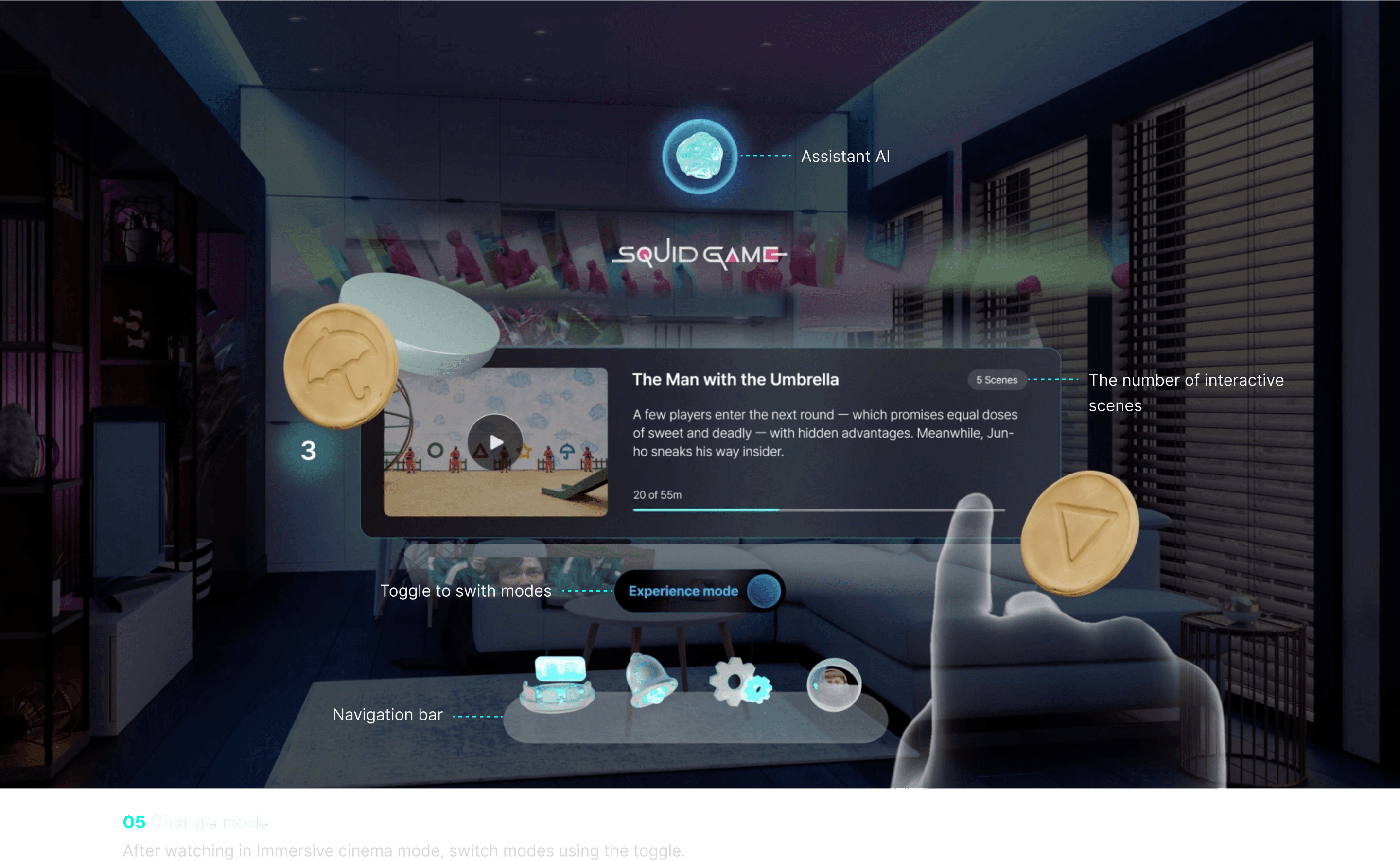 This project's objective was to create XR headset hardware and service that goes along with it. I learned how to design hardware and software to fit together well. Also, in particular, I discovered the hidden needs of users watching OTT services and created XR content that can be experienced from the perspective of the protagonist, which is a novel idea that points out a new direction for XR technology. This idea was shortlisted for 2023 Red dot design award in category of 'AR/VR' and 'entertainment'.