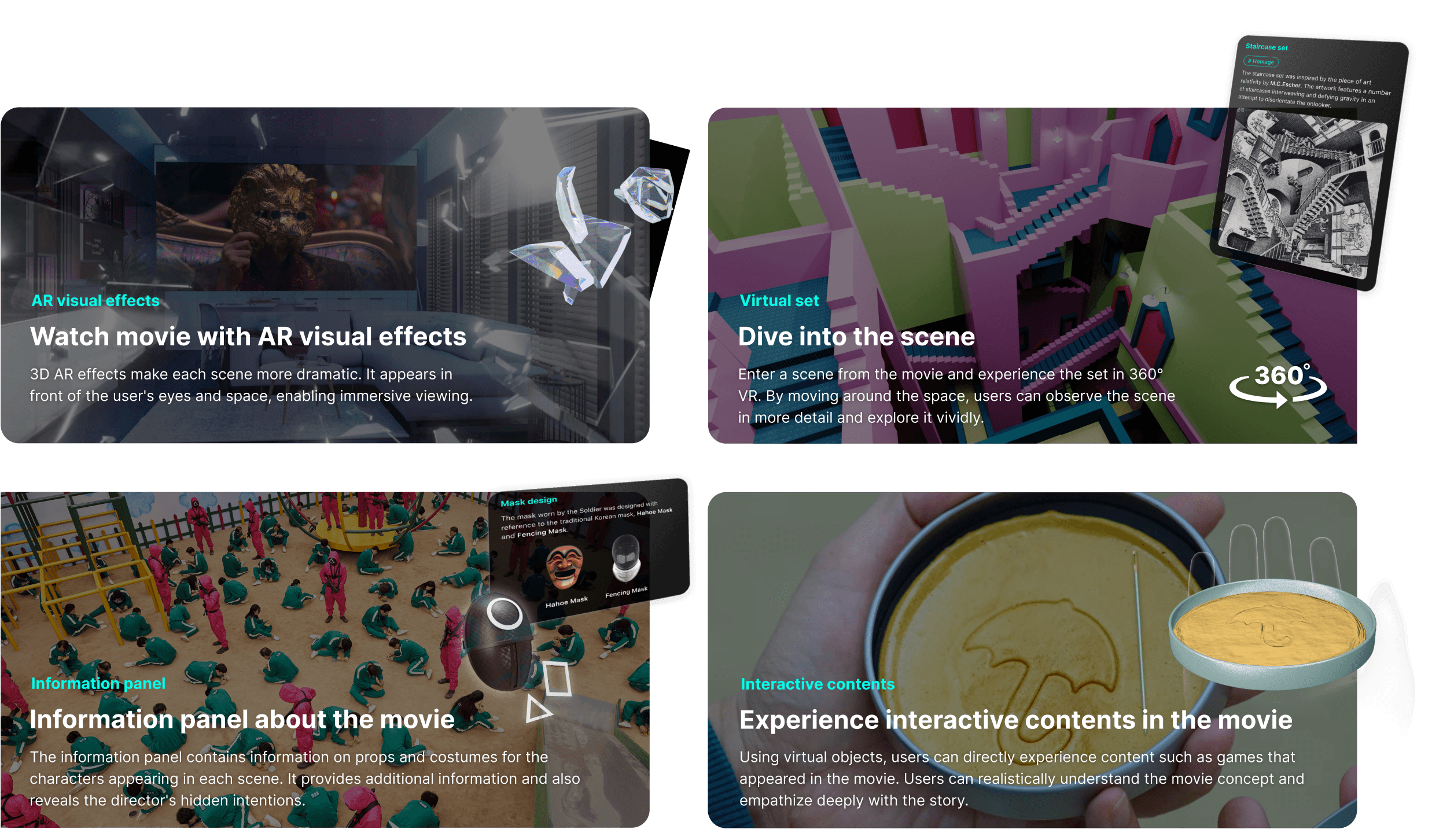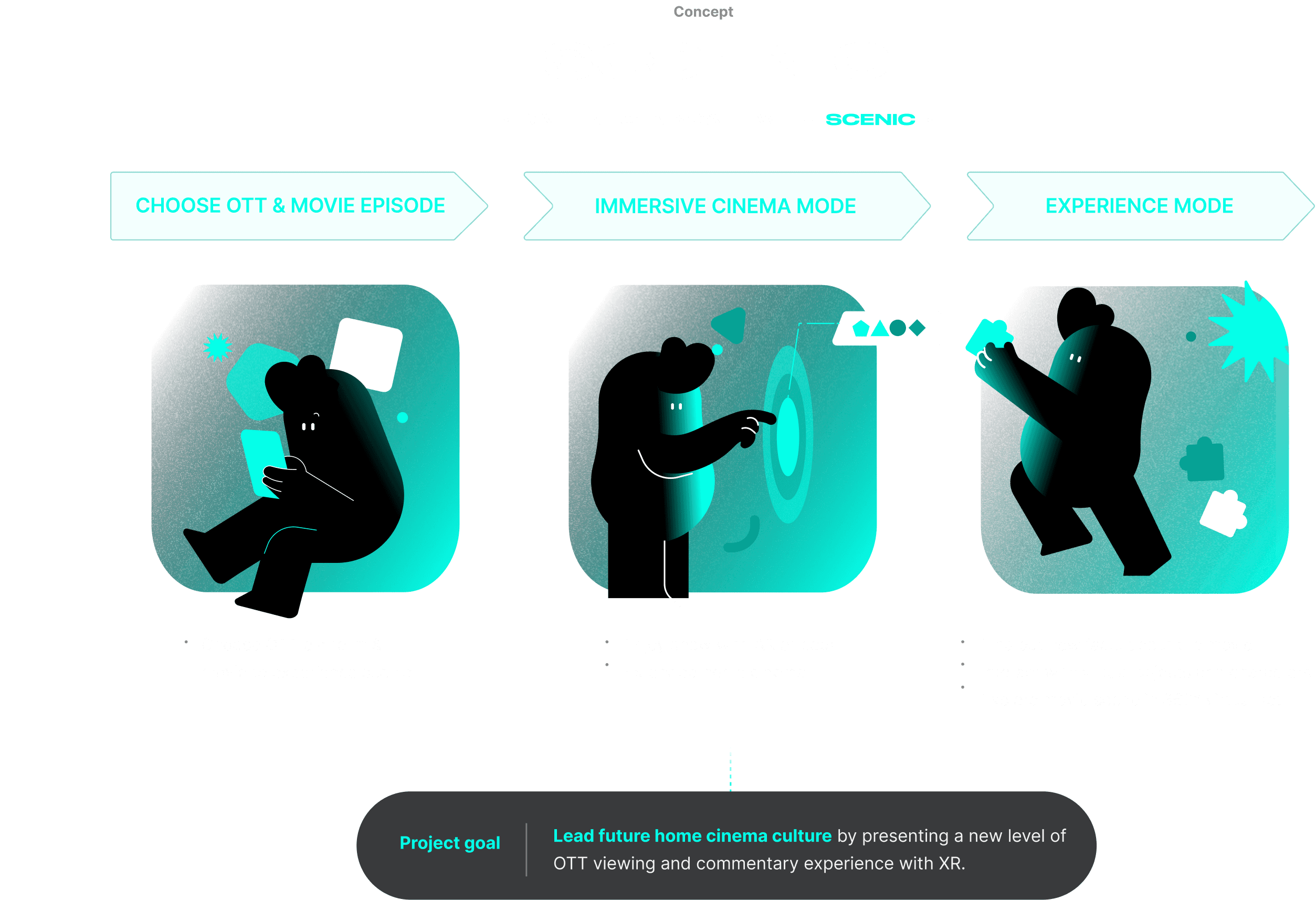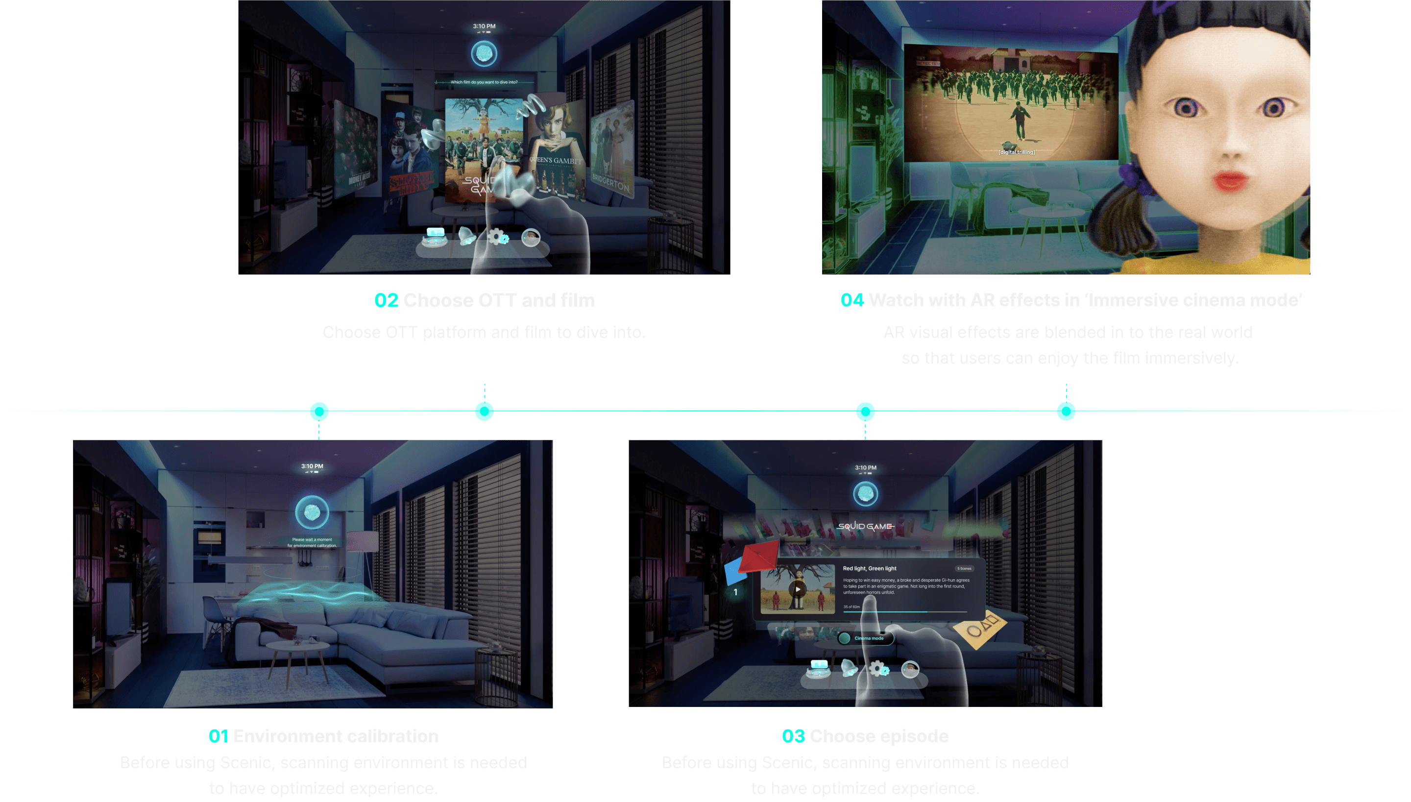 Scenic is an XR glass linked with OTT platforms that allows you to watch movies more vividly and experience contents hidden in the movies. Users can experience in-depth cinematic appreciation by watching the film more immersively with AR effects. Also, users can find hidden stories and easter eggs in detail through AR and VR. Finally, users can also experience immersiveness by entering the virtual space of the film.
