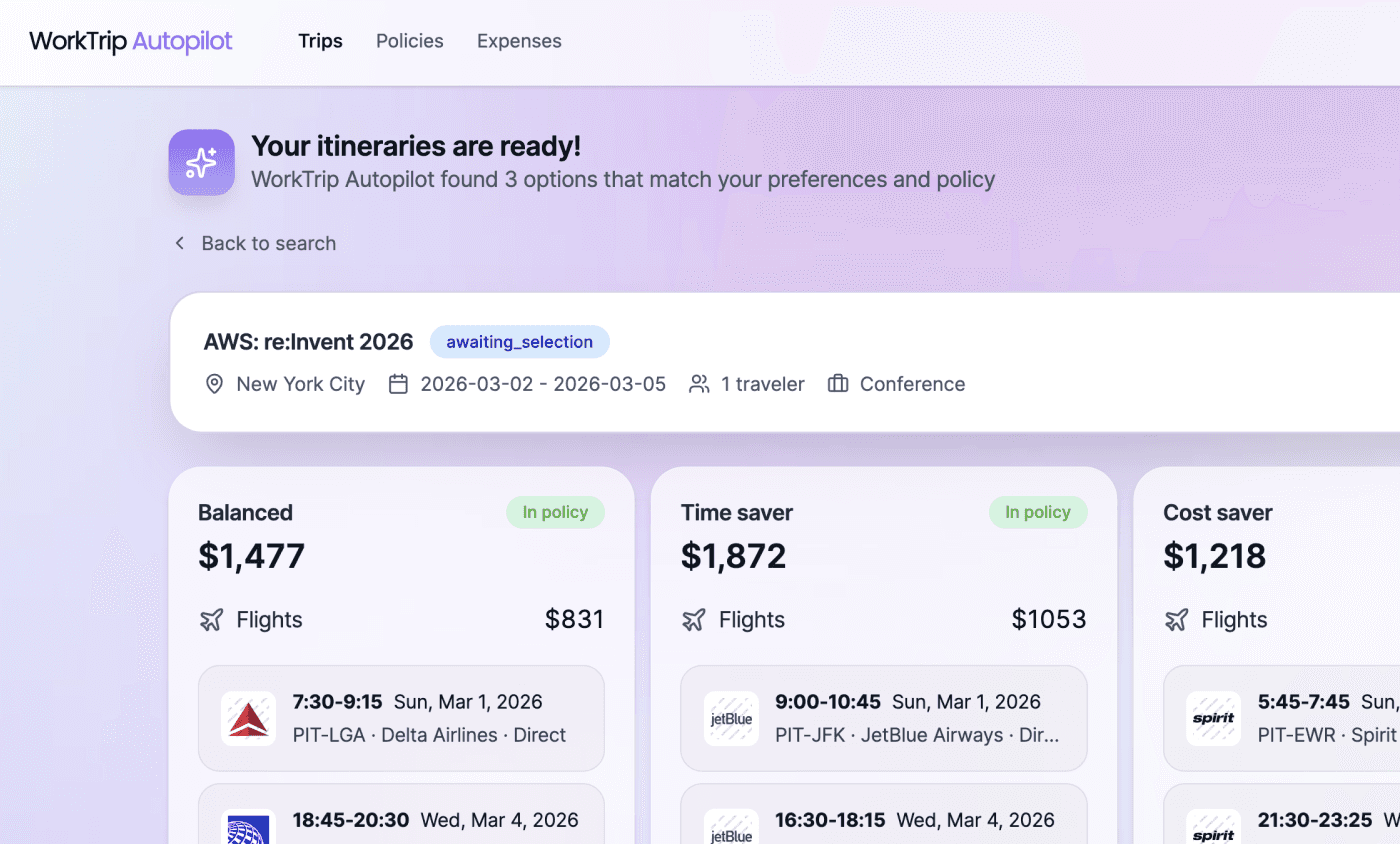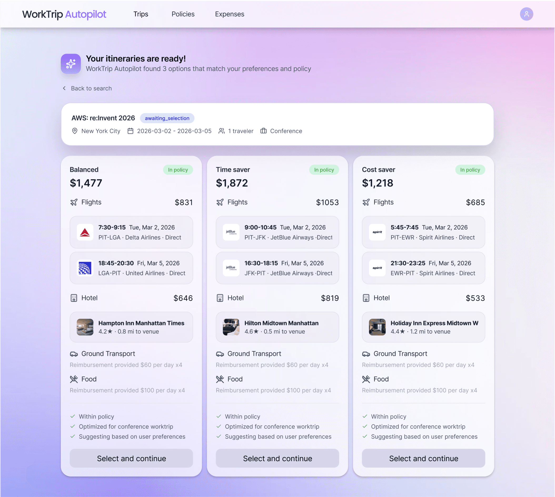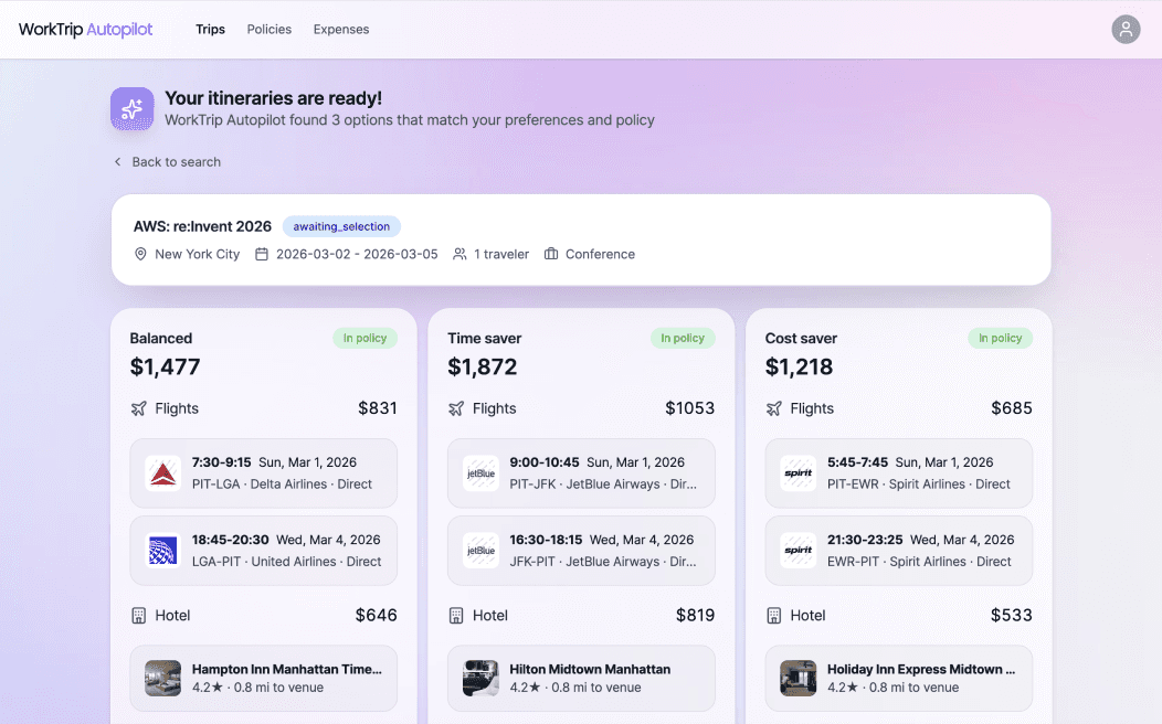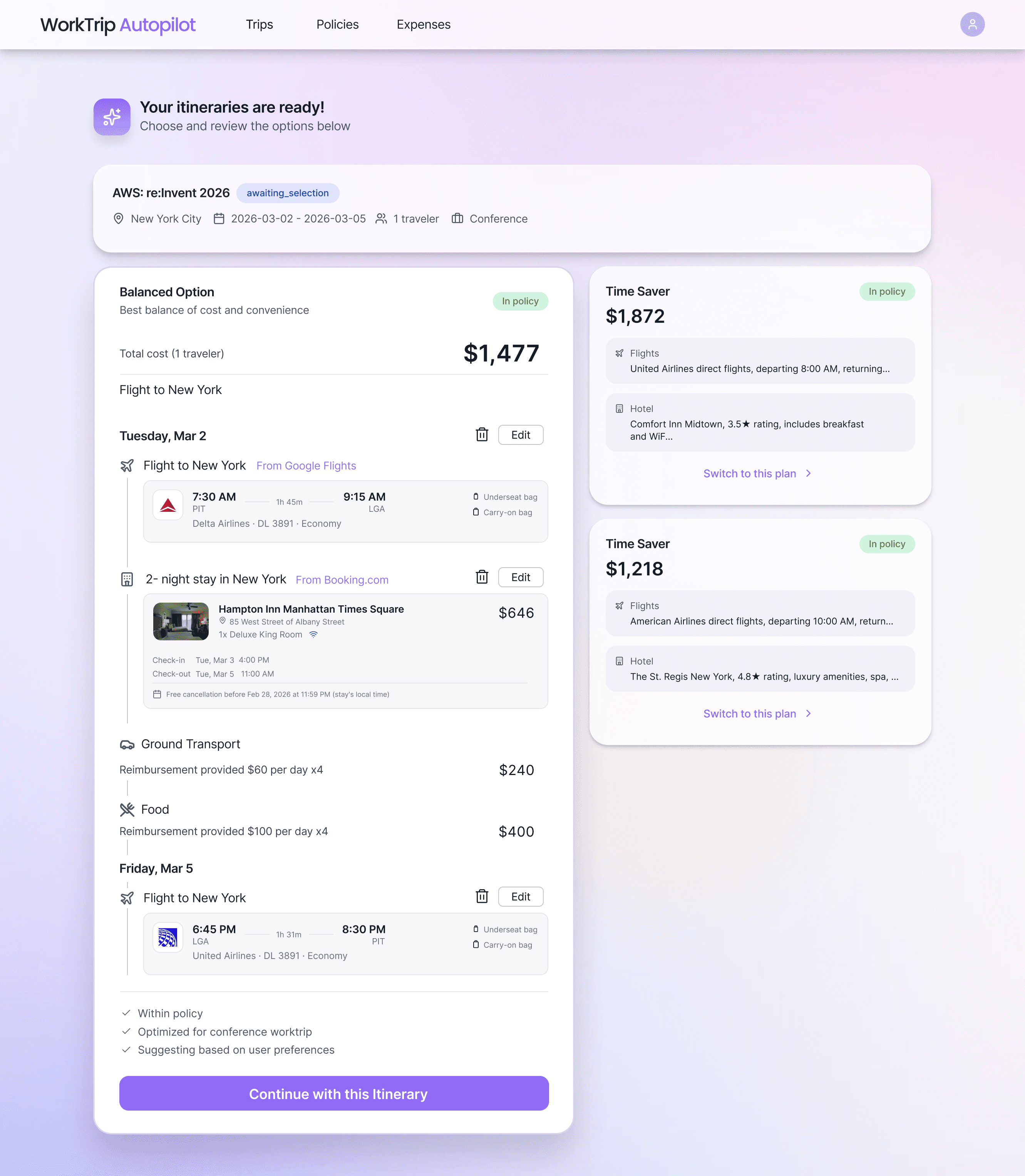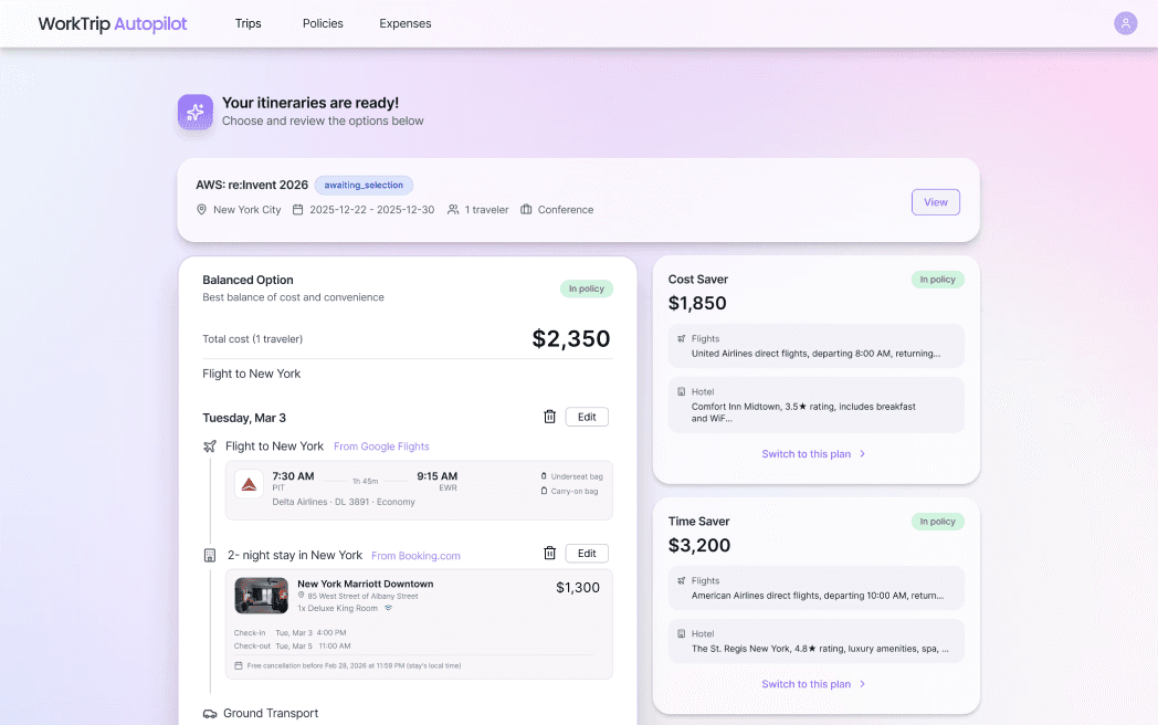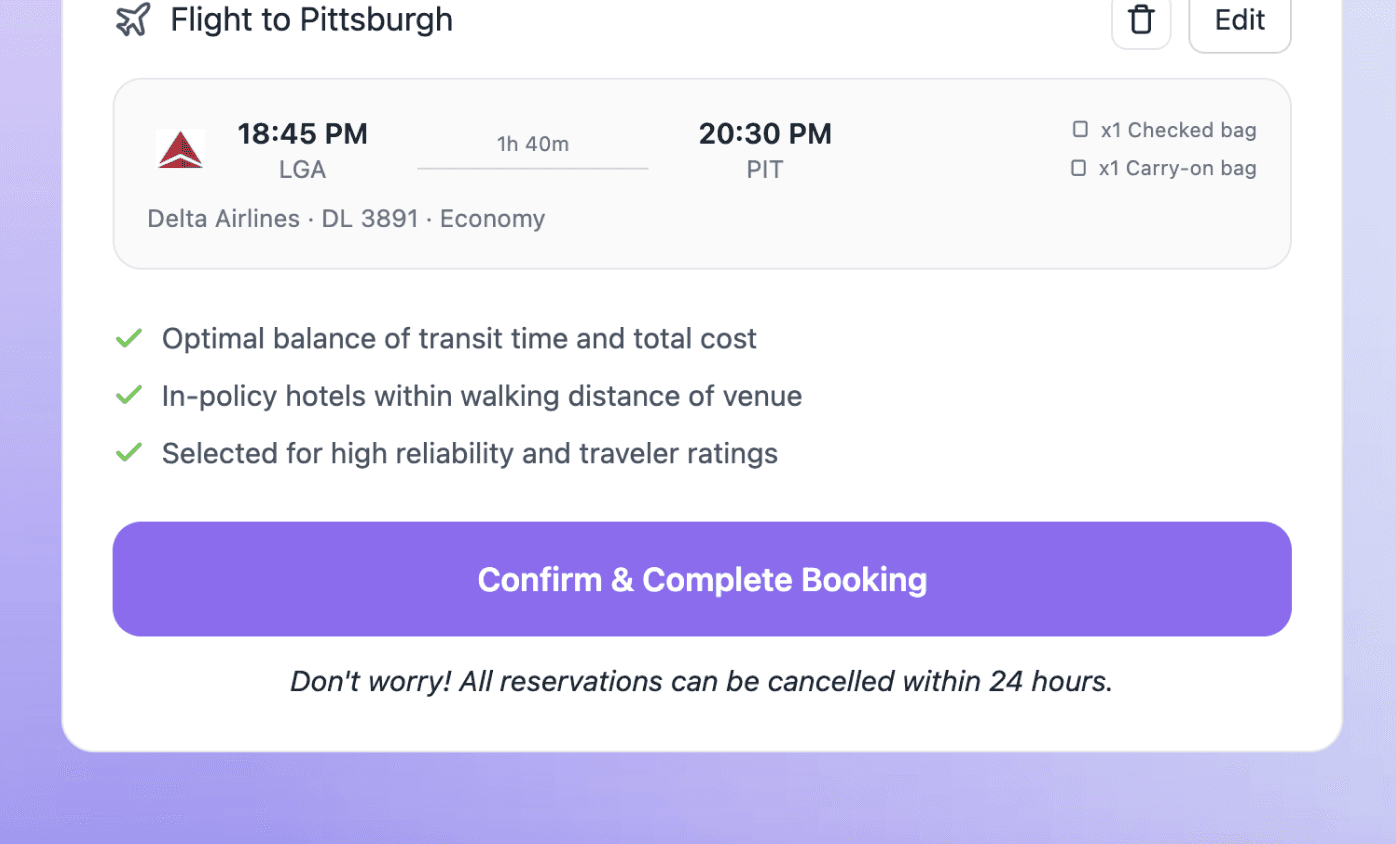 The agent searches, books flights and hotels, ensuring all options are in-policy. It synthesizes the best itinerary based on team cohesion, cost, user’s preference and tendency.