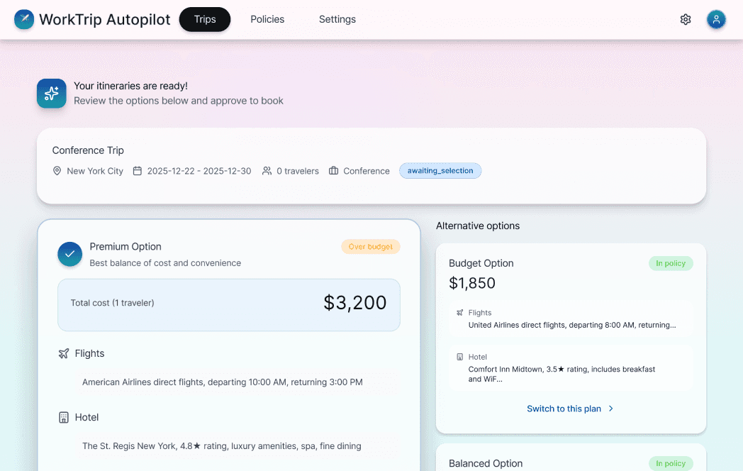 I simplified the initial flow by reducing the user’s role to reviewing and approving the itinerary, while allowing the system to manage the intermediate steps. This helped create a more agent-like experience and lowered friction.