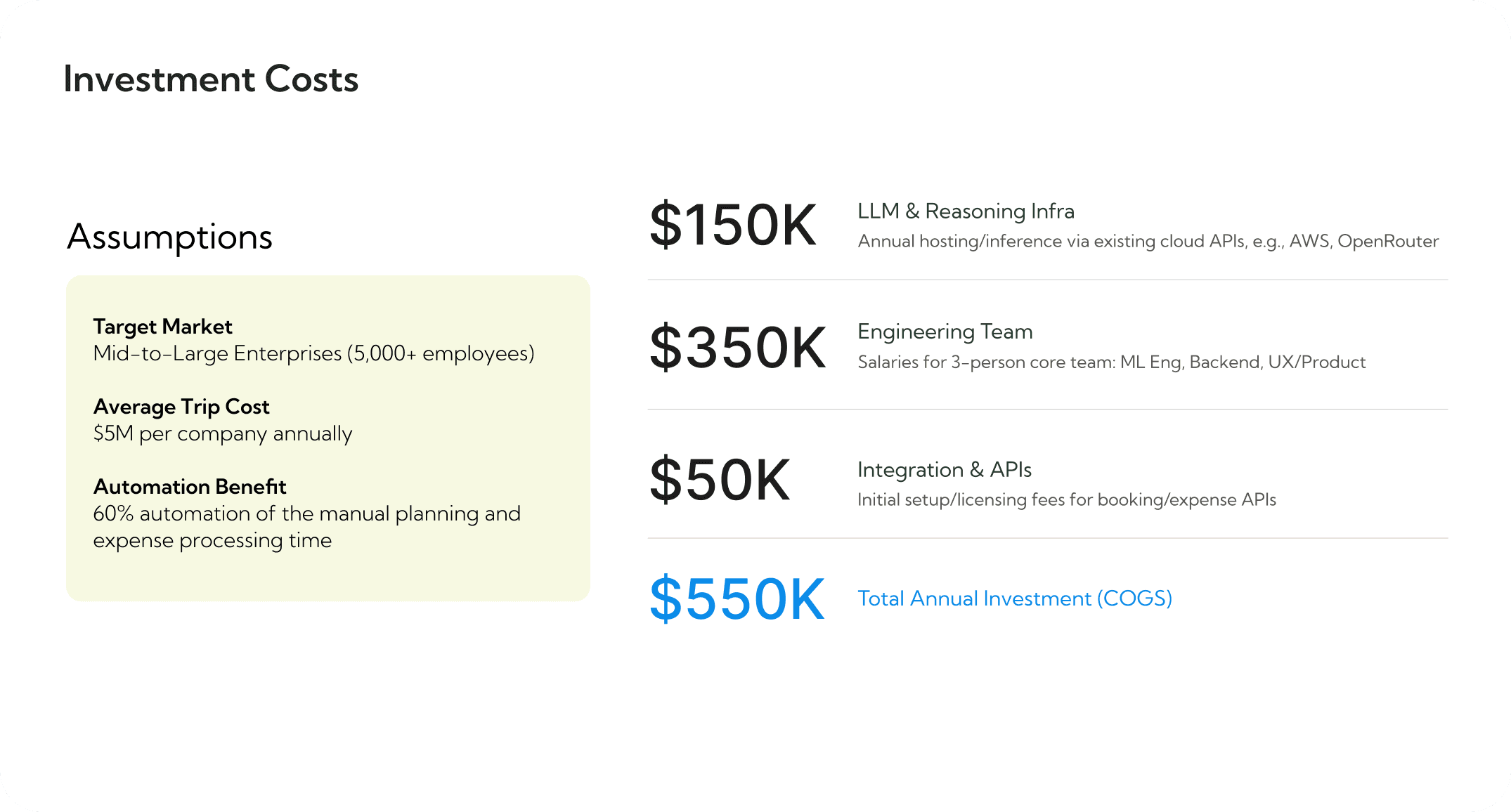 With the help of AI, I modeled the opportunity by defining a conservative 3% adoption within our target market: Mid-to-Large Enterprises (5,000+ employees). The cornerstone of our value proposition is the assumption that the Agentic AI can deliver a 70% Automation Benefit of the manual planning and expense processing time.